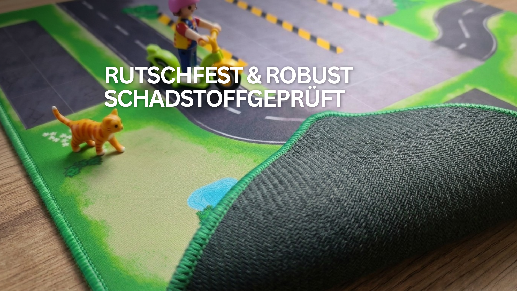 Rutschfeste Unterseite, genähter Rand und geprüfte Materialien - für sicheres Spielen